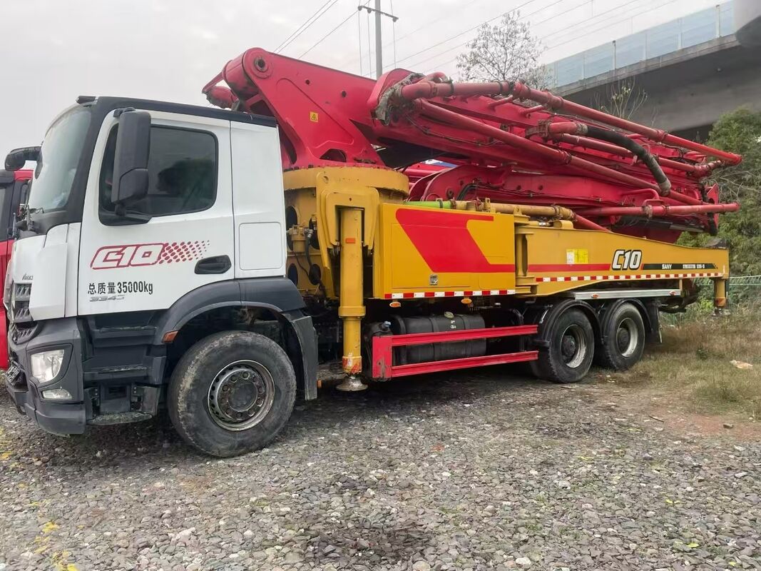 Технические характеристики: Модель SYM5353THB 520C-10 с 52-метровой стрелой, производительность более 80 000 м³, шасси Mercedes 2020 года, соответствует экологическому стандарту China Stage V, 1600 моточасов, пробег 23 000 км.